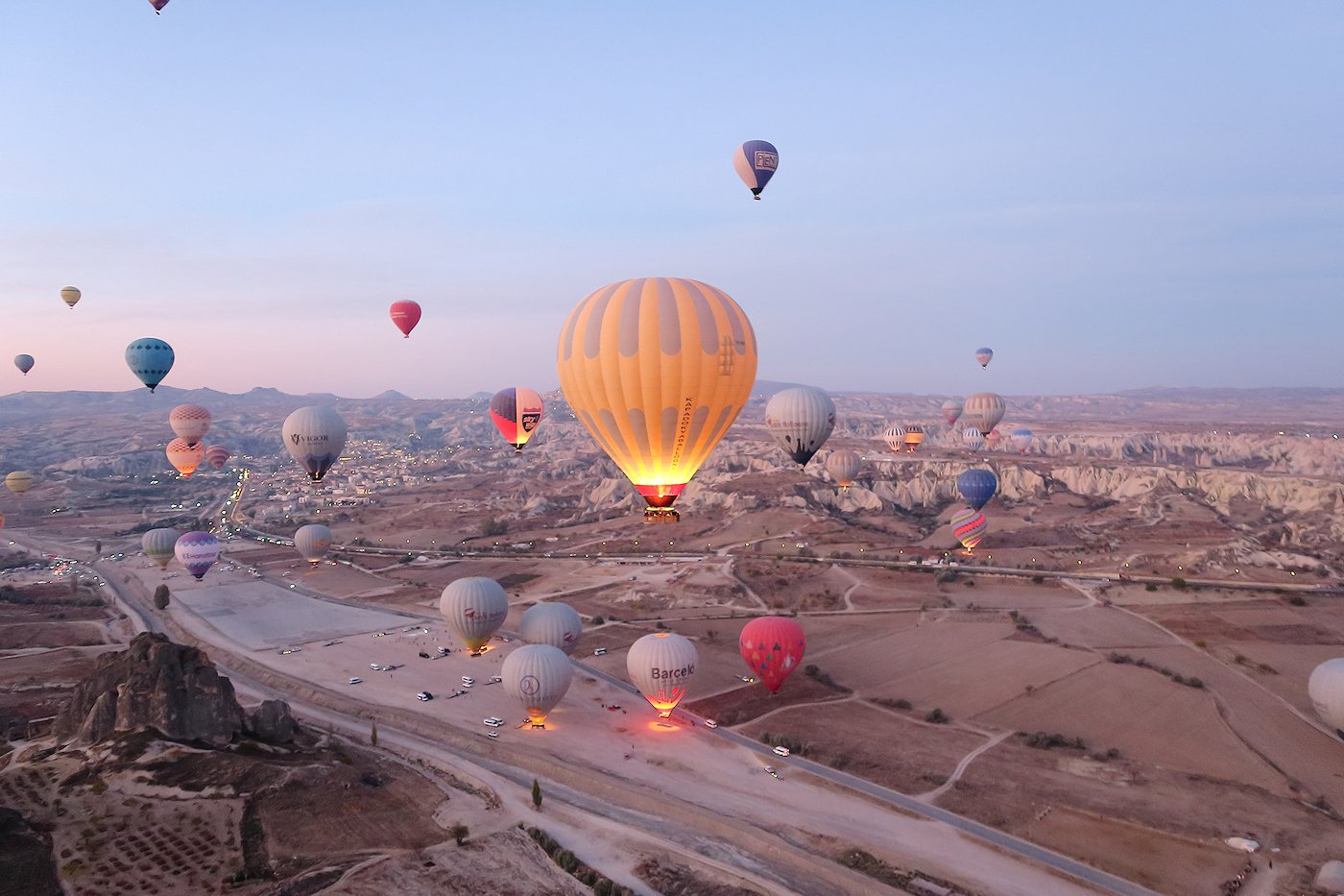 翌日、アンカラ市内、トゥズ湖観光をしてカッパドキアへ。地下都市見学後、トルコ石みやげ店へ連れていかれ、ホテルに着いたのは午後7時。翌早朝、夜明け前にホテルを立ち熱気球飛行。絶景を眼におさめつつ気球に乗る。これが楽しみで伴侶はトルコへ行きました。カッパドキアは2泊、気球に乗るチャンスは3回というツアーだったけれど、晴天にめぐまれ1回目でクリア。