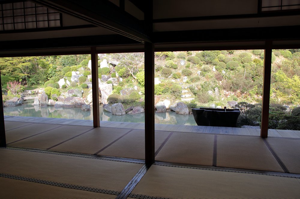 田沼屋敷で重三郎と意次が会話を交わす場面。智積院の襖絵と庭園。有名な庭ではないから拝観する人は少ないが、座敷が横に長く、畳、縁側を入れて眺める庭は、池の色、つくばい、築山が調和し、撮影に適している。